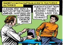“The Trial of Captain Kirk” – even the title is reflective of a Star Trek episode (“Court Martial”). Kirk is accused of accepting bribes to protect pirates. In order to fight these charges, Kirk undergoes cosmetic surgery so that he can escape the watchful eye of the Federation. The surgery … gives him an afro. (I kid you not!)